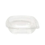 VG PET Tamper Evident Square Bowls are perfect for leaf or pasta salads, cut vegetables, cut fruit, nuts, candies and other specialty foods.. Available in 5” (Small), 7.5” (Medium) and 9” (Large) convenient diameters. These square bowl options are stackable and increase the shelf space efficiency by 25% over round bowls. Crystal clear lids give the consumer a clear view before buying and they are also crack-resistant and spill-proof to ensure safe and stable handling. Black bases available in custom option.